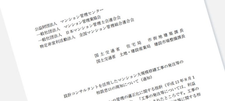 2017.9.27 国土交通省住宅局から通知 今年1月、国土交通省が「設計コンサルタントを活用したマンション大規模修繕工事の発注等の相談窓口の周知について」という通知を出しました。設計コンサルタントについて、どのようにすれば良いかお悩みを抱えておりましたら、お気軽に 続きを読む