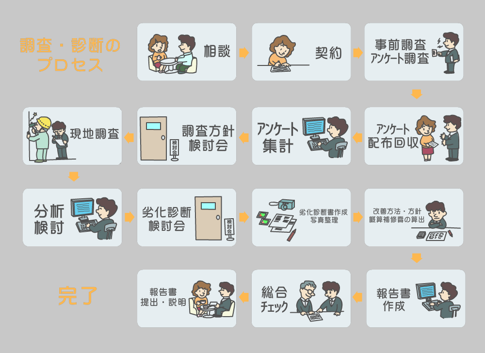 ここまでのプロセスで建物劣化診断は終了です。通常は、この診断の結果を基に大規模修繕工事や長期修繕計画をすすめることになります。